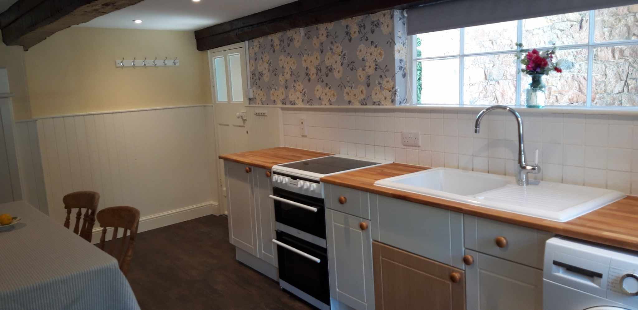 Cottage style two bedroom character flat comprising : fitted kitchen diner with fridge/freezer, washer/dryer and electric cooker, having a beamed ceiling and dual aspect windows. Staircase leading to first floor living room, two bedrooms and bathroom with over bath shower.