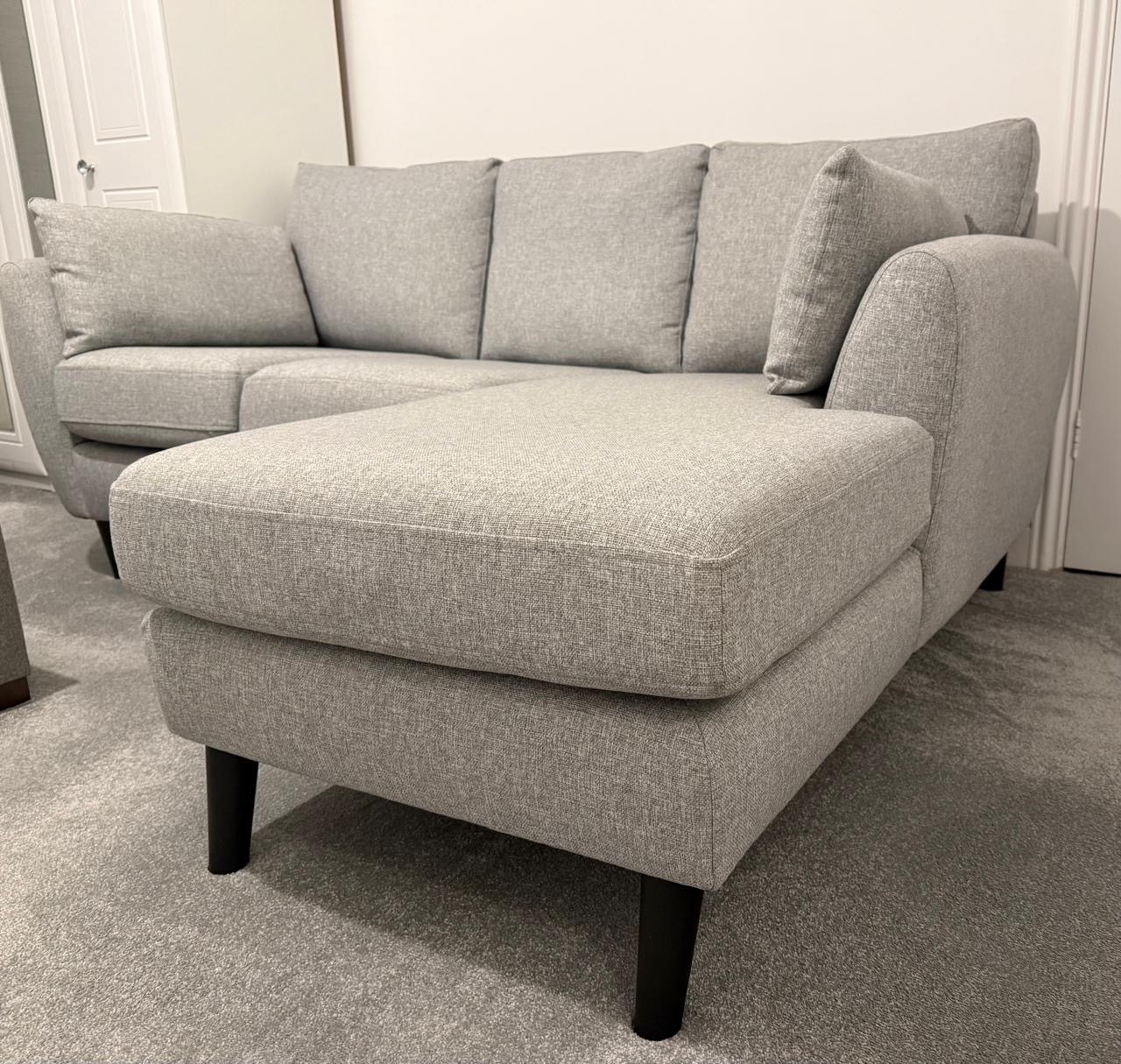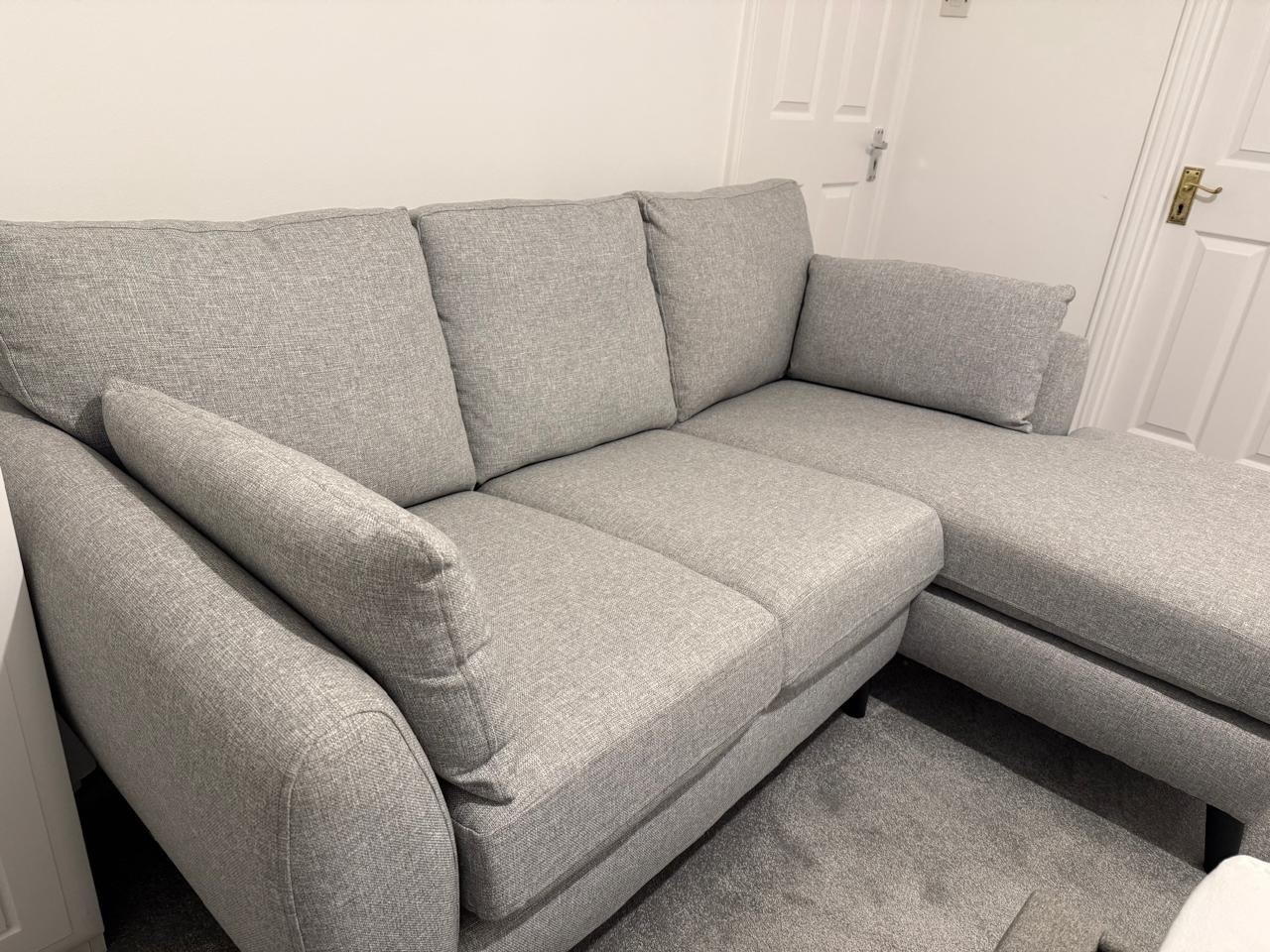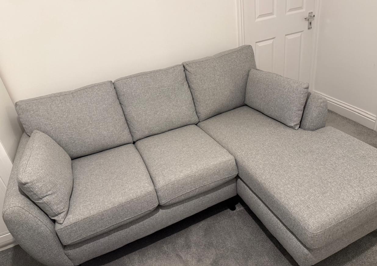 Small L Shaped sofa. Bought from Next just over a year ago. Light silver. Black legs. Impeccable condition. Owner is a non smoker, no pets and no children. Label is still on. Absolutely flawless. Collection only. St Helier.