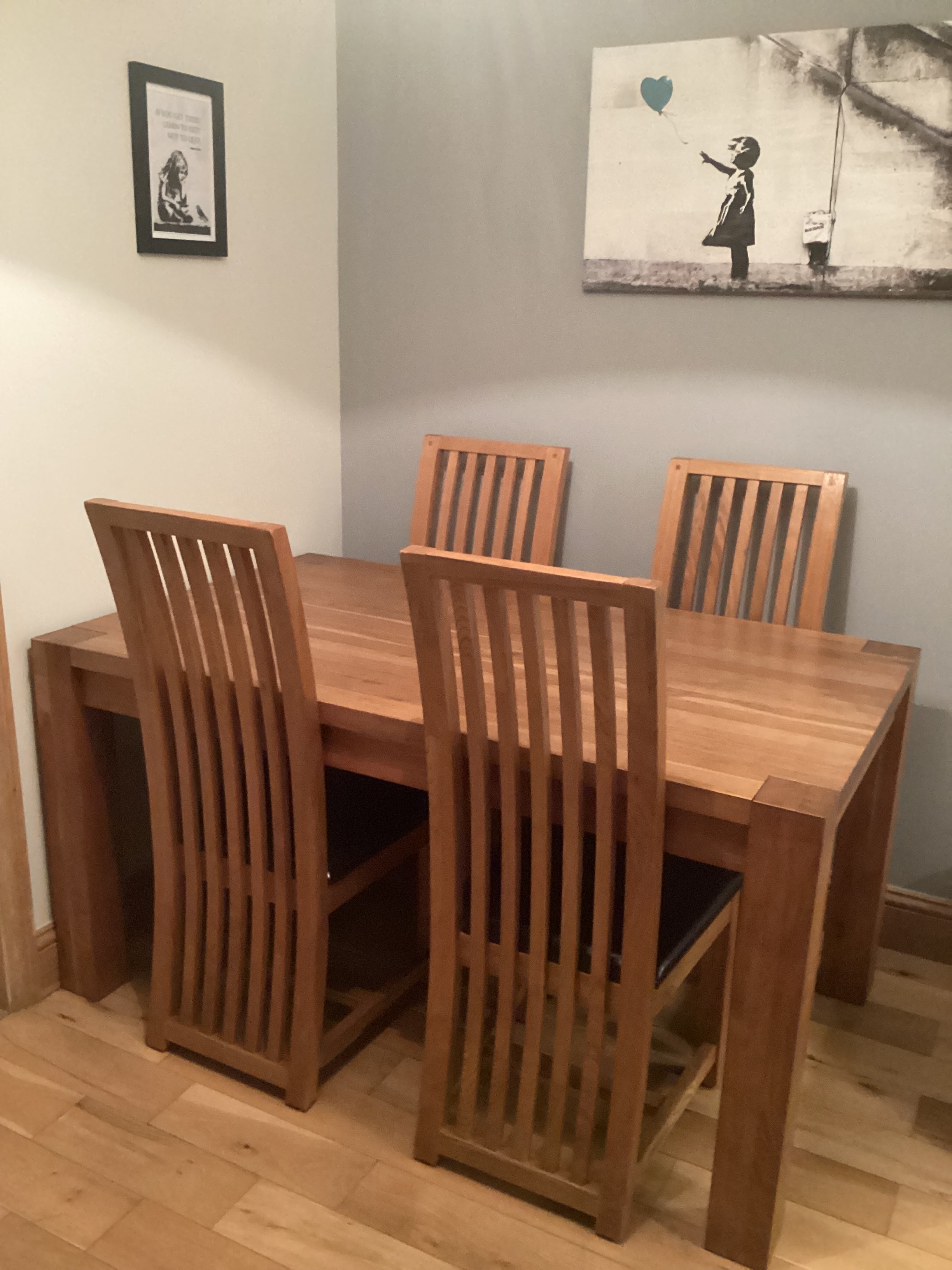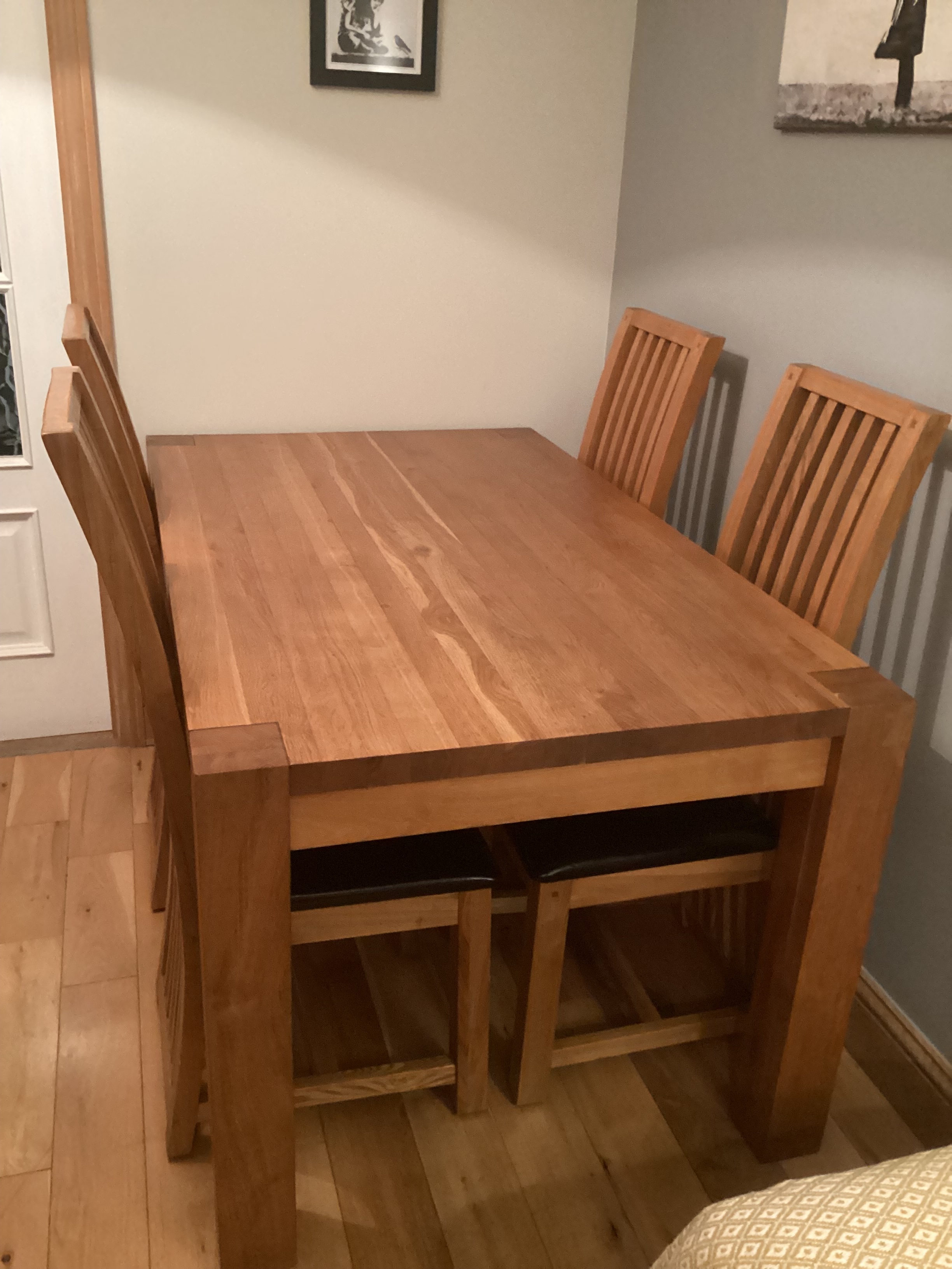 Solid oak dining table with four chairs, seat covers will need to be recovered otherwise in good condition. W150xD89xH77cm. Collection only.