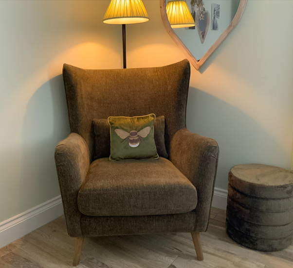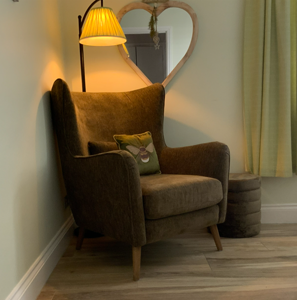 (Next) Soft Velvet Wilson Highback Chair (Large), Olive Green with (Next ) matching Olive Green Stella storage stool. Purchased 5 weeks ago for £495. Asking £195 for both.