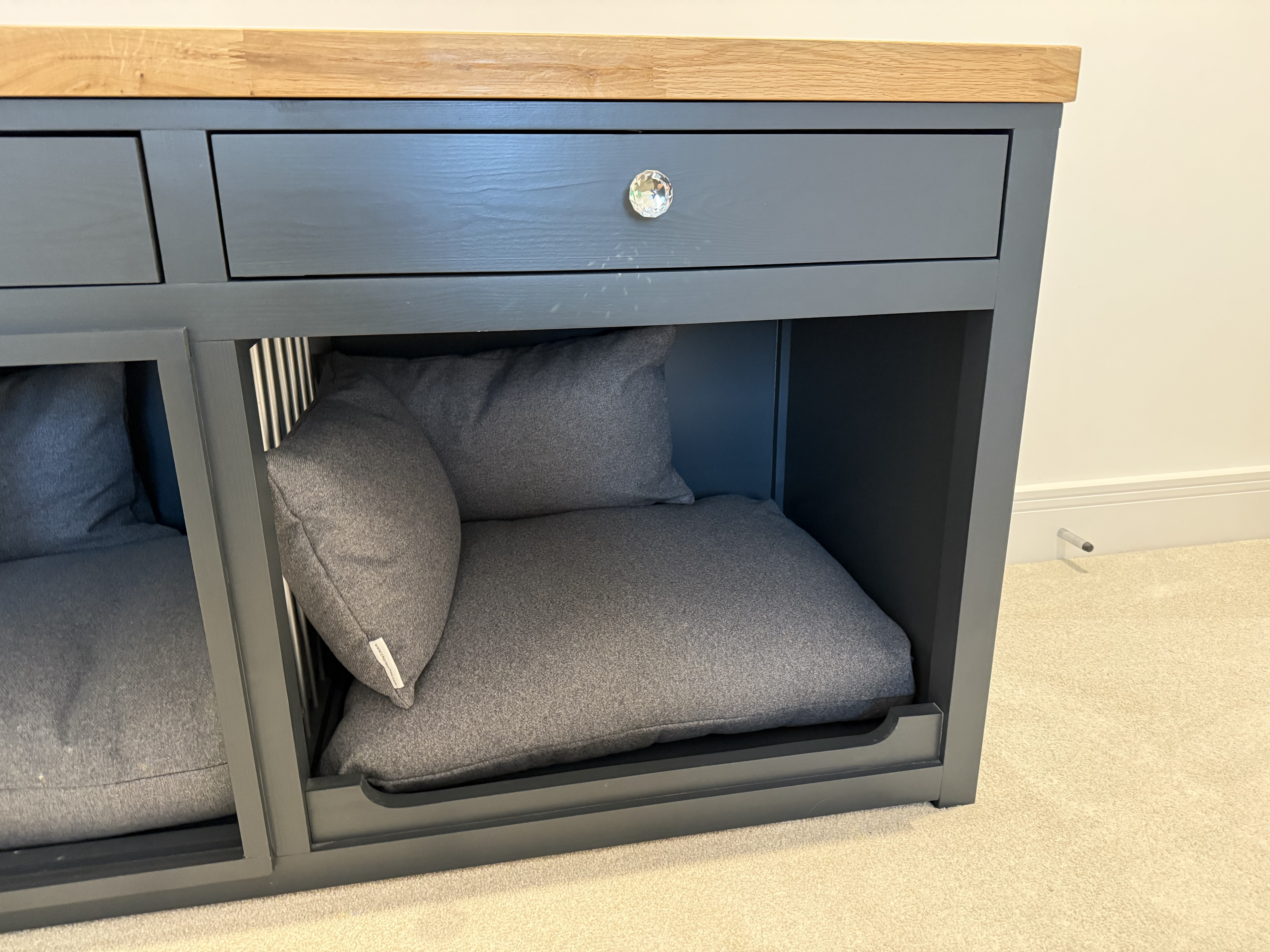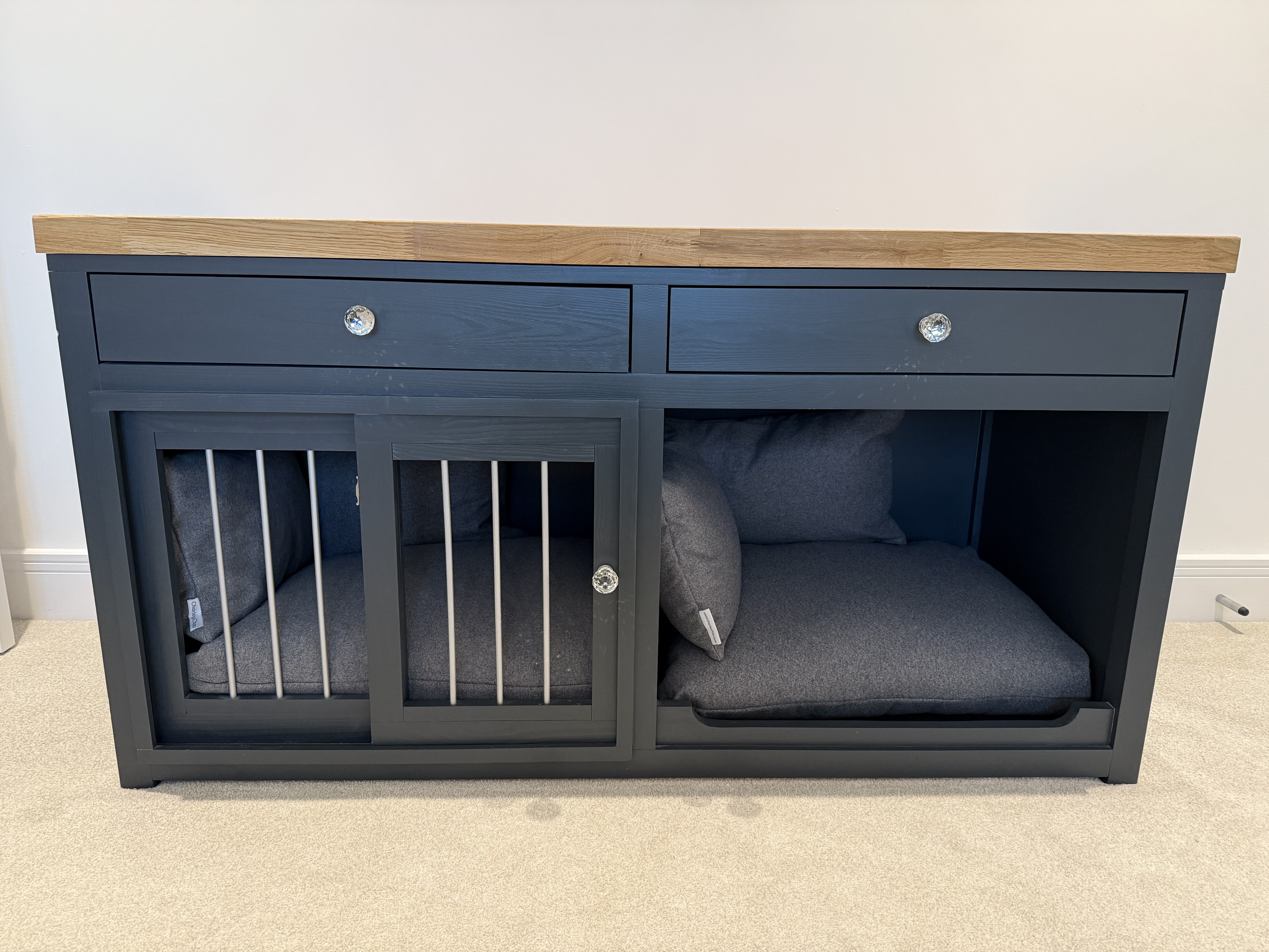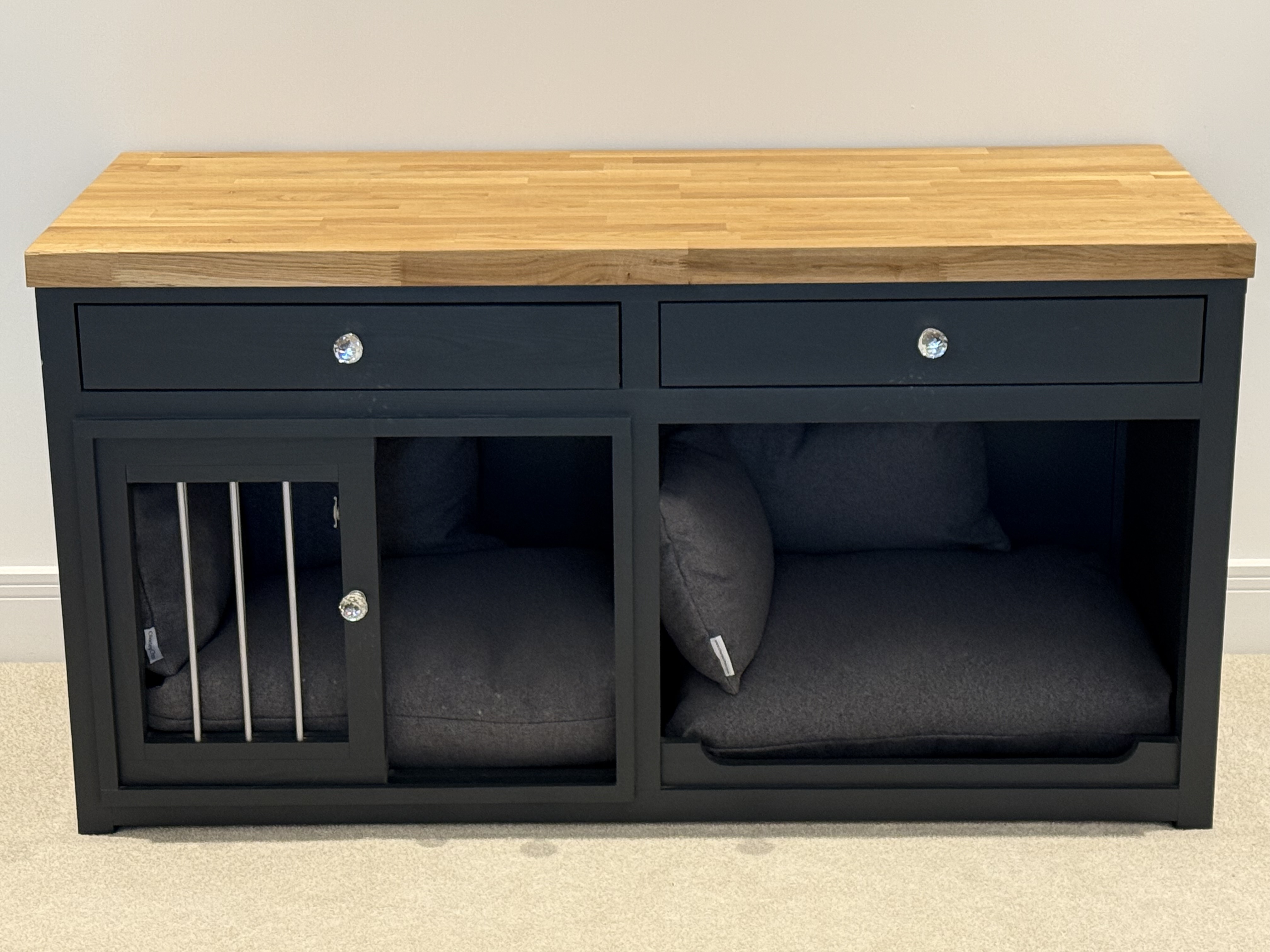 It is a dark grey colour with a solid oak top and crystal knobs. There are two useful draws above the bed compartments and one of the compartments has a sliding gate door so that the pet can be crated if necessary. It comes complete with Charley Cjau mattresses and bolsters.