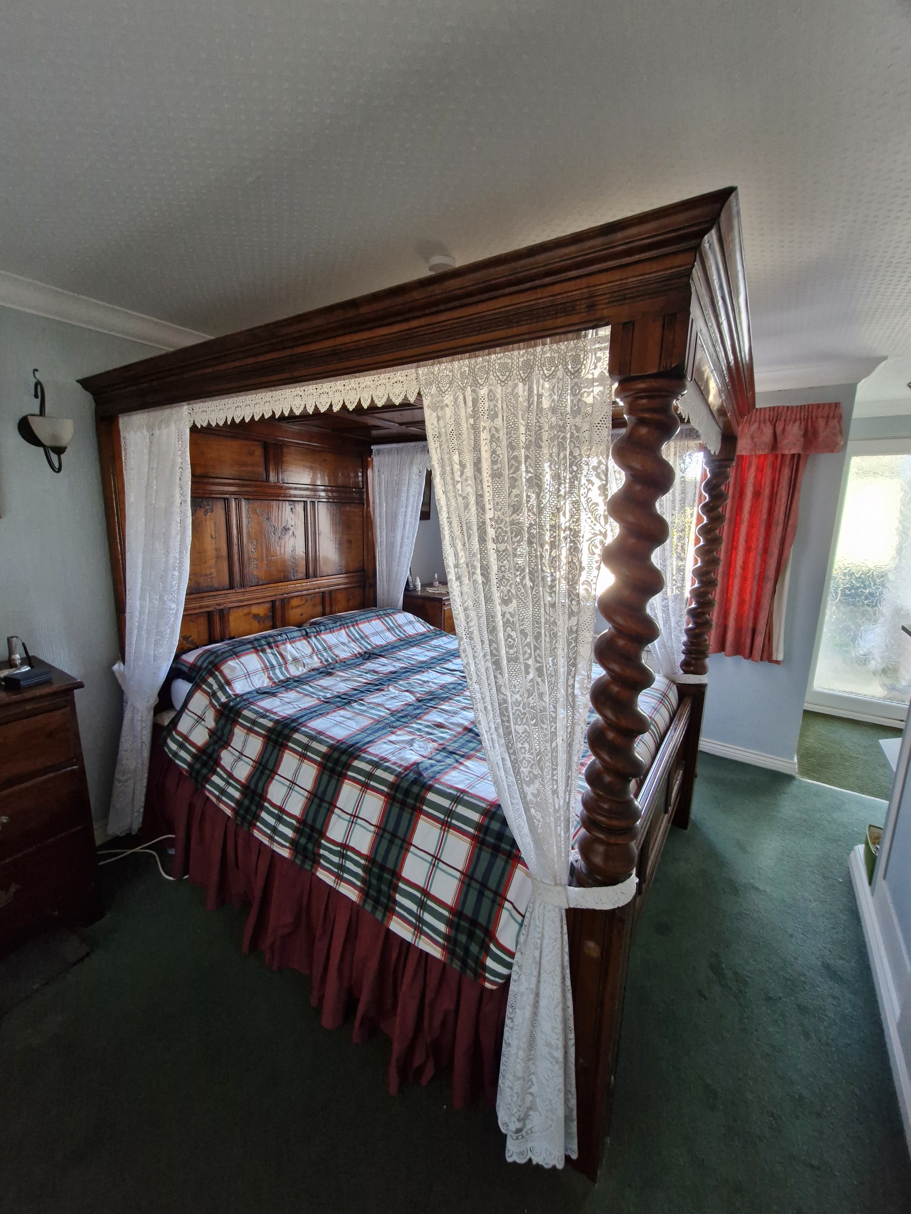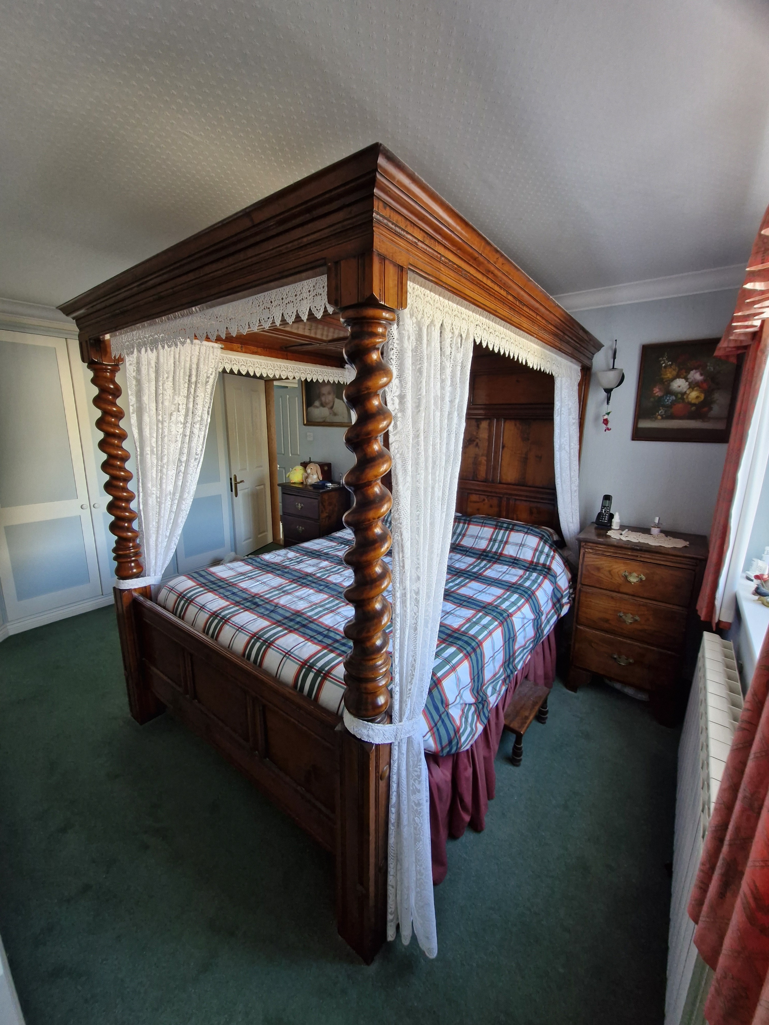Beautiful 5ft four poster bed with barleytwist pillars. Lace is removable. Buyer to arrange collection.