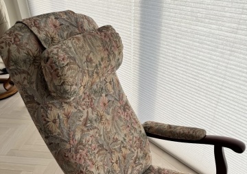 Upright wooden armchair. Spring loaded base for ease of getting up out of the chair which is operated by a...